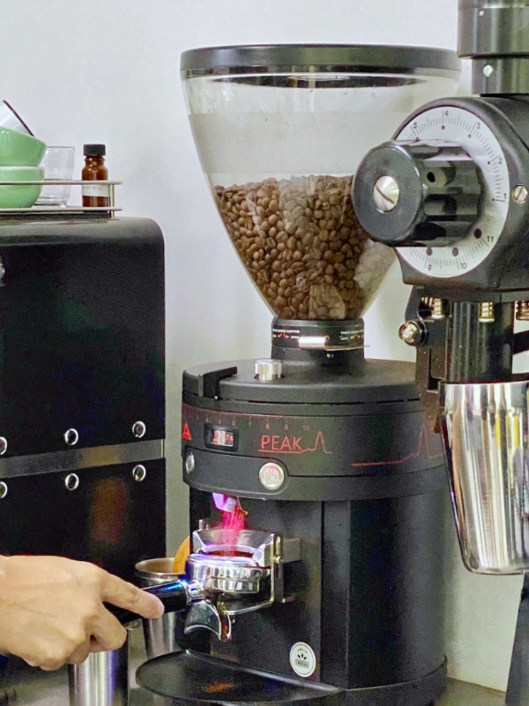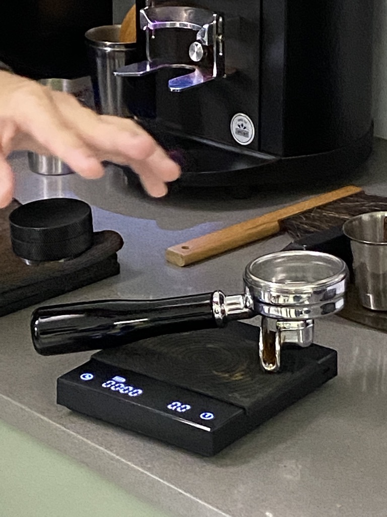 Coffee is precise. So the scale is very important. Measure the portafilter and make sure it’s scaled down to 0 and then you can move on to grind the coffee