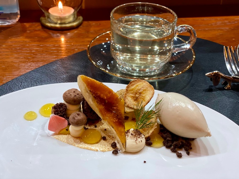 Dessert came in the form of banana icecream, banana chips, creme brûlée, banana cake, white chocolate and dark chocolate meringue. You have thought it would be a single profile of sweetness but to my surprise, there was varying degrees of sweetness. The icecream and cake was balanced with the creme brûlée and meringue . In all, it was a pretty good dessert