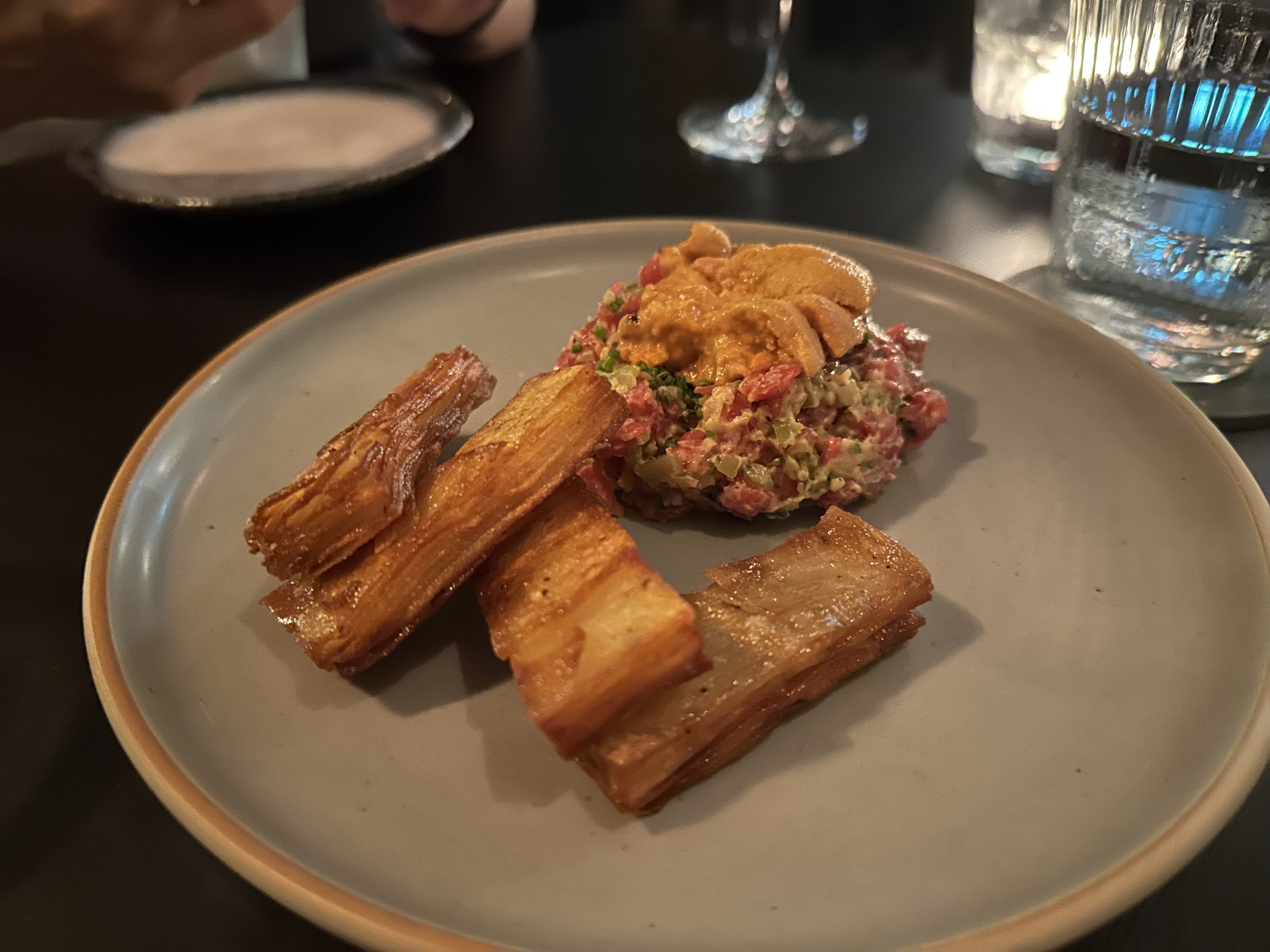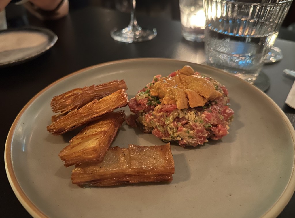 Black Angus Beef Tartare w Layered Potatoes $23 + Hokkaido Bafun Uni $19