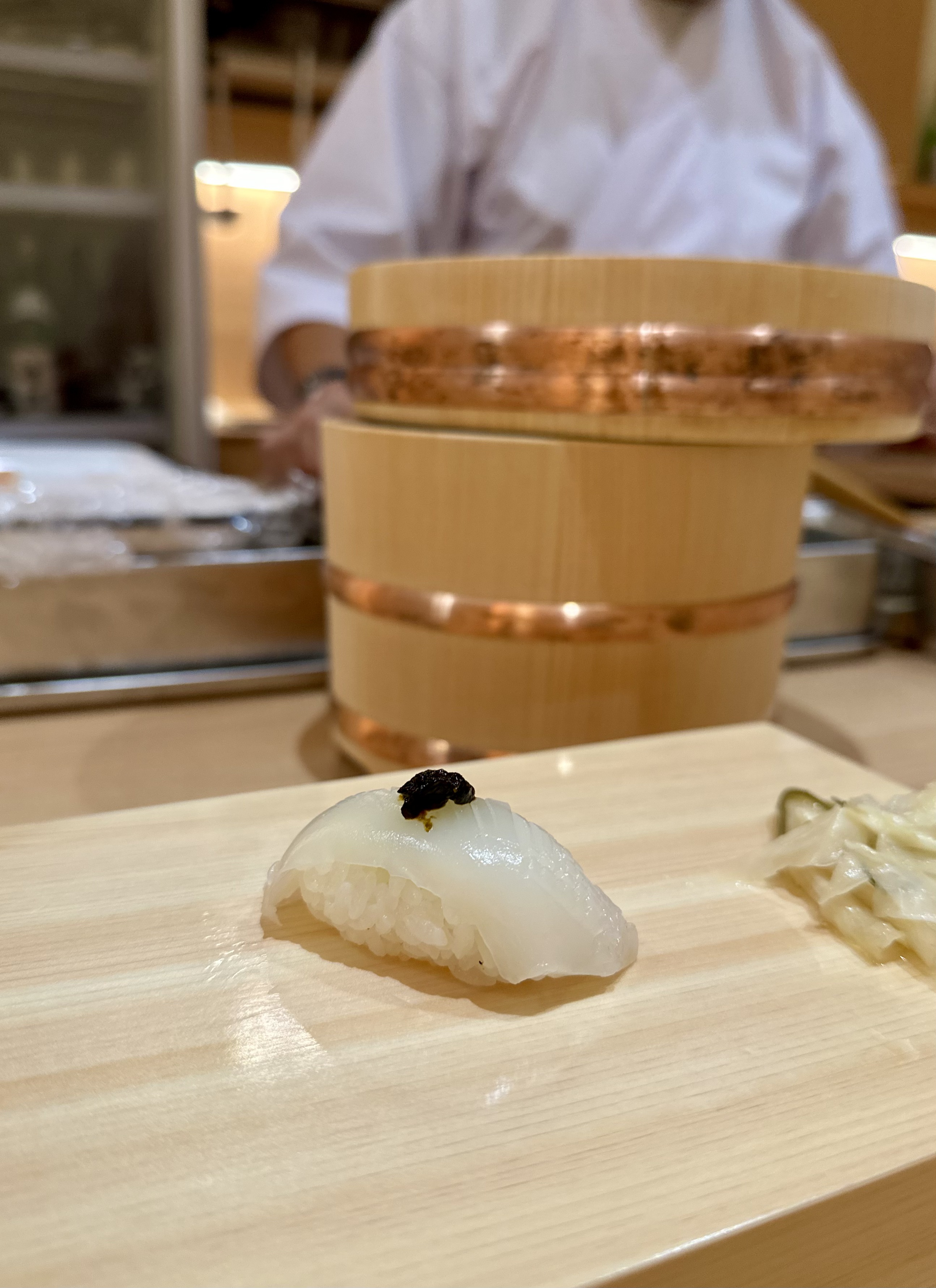 The taste of truffle elevated the fish slightly though the friend commented it’s a little oily overall. Then the chef said, oh – some people liked it with lots of truffle and they wanted it with more truffle. I think the friend and I just looked at each other and went – they come here eat sushi or drink truffle?