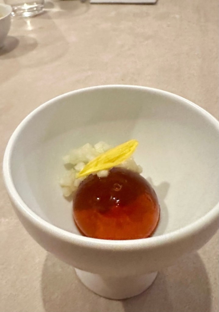 We were guessing what would be the surprise. We didn’t guess it would be noodles. Inspired from somen, they topped it up with scallops using wheat noodles, with nutty perilla oil, soy sauce and Korean seaweed. It’s good. I loved it. I thought the flavours worked and the texture of the noodles was delicious