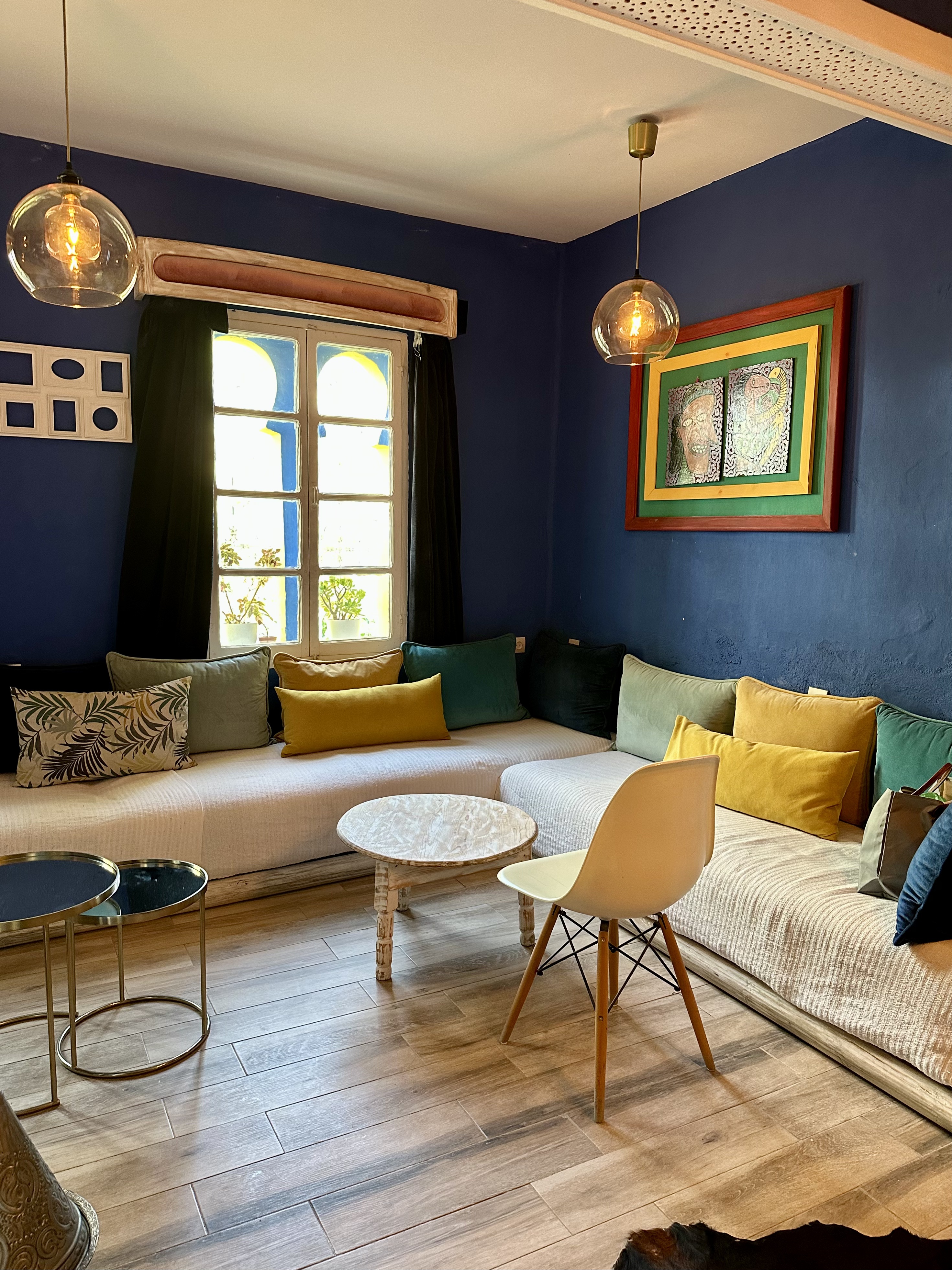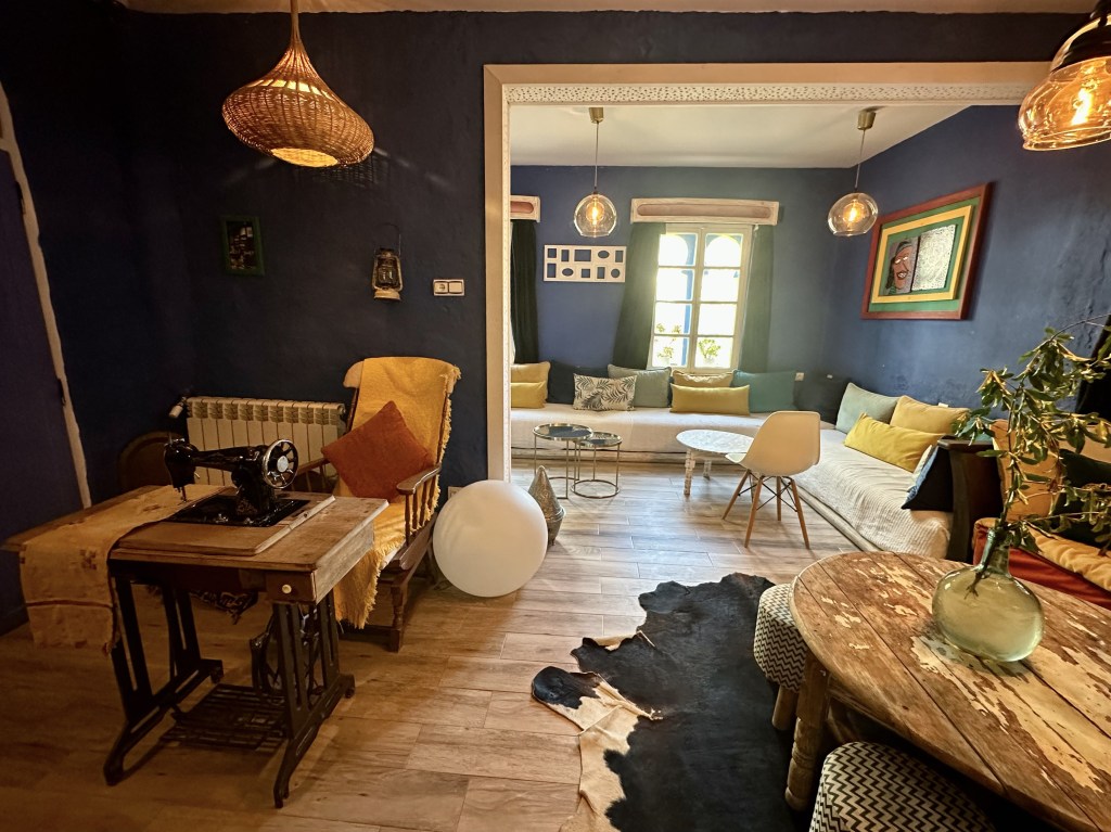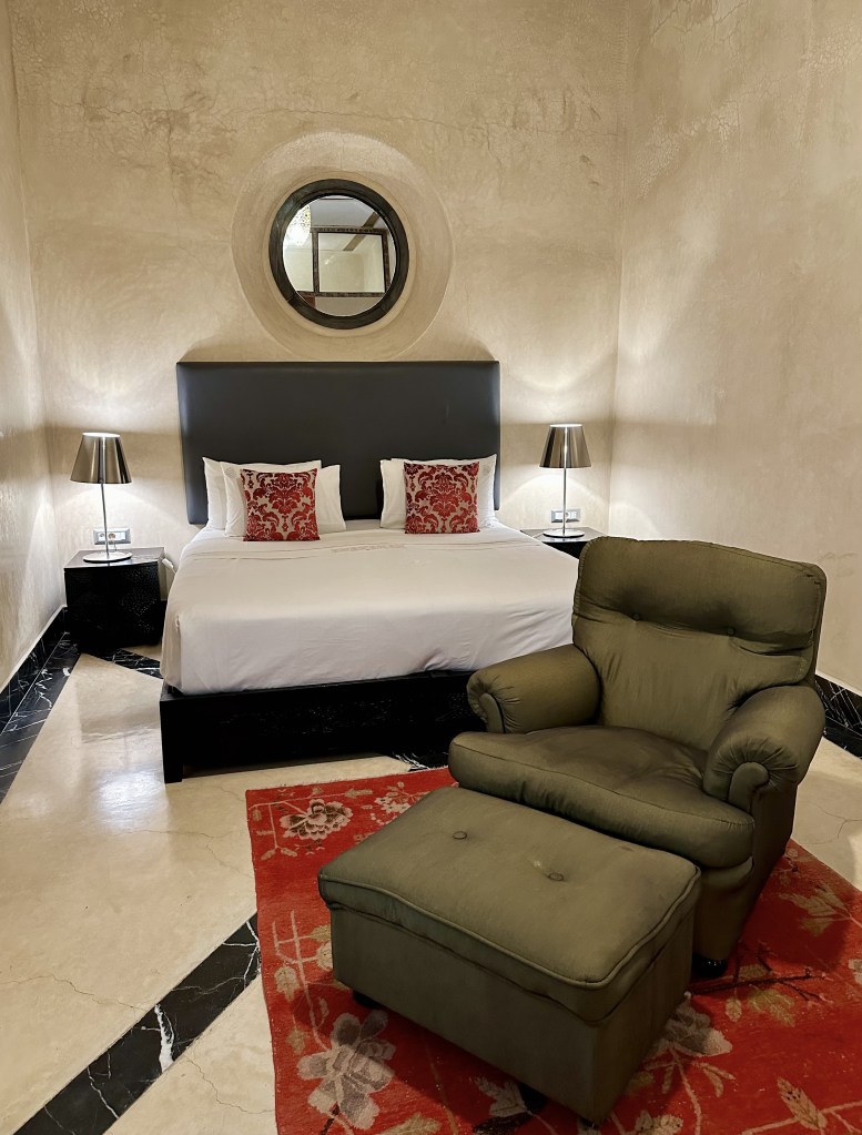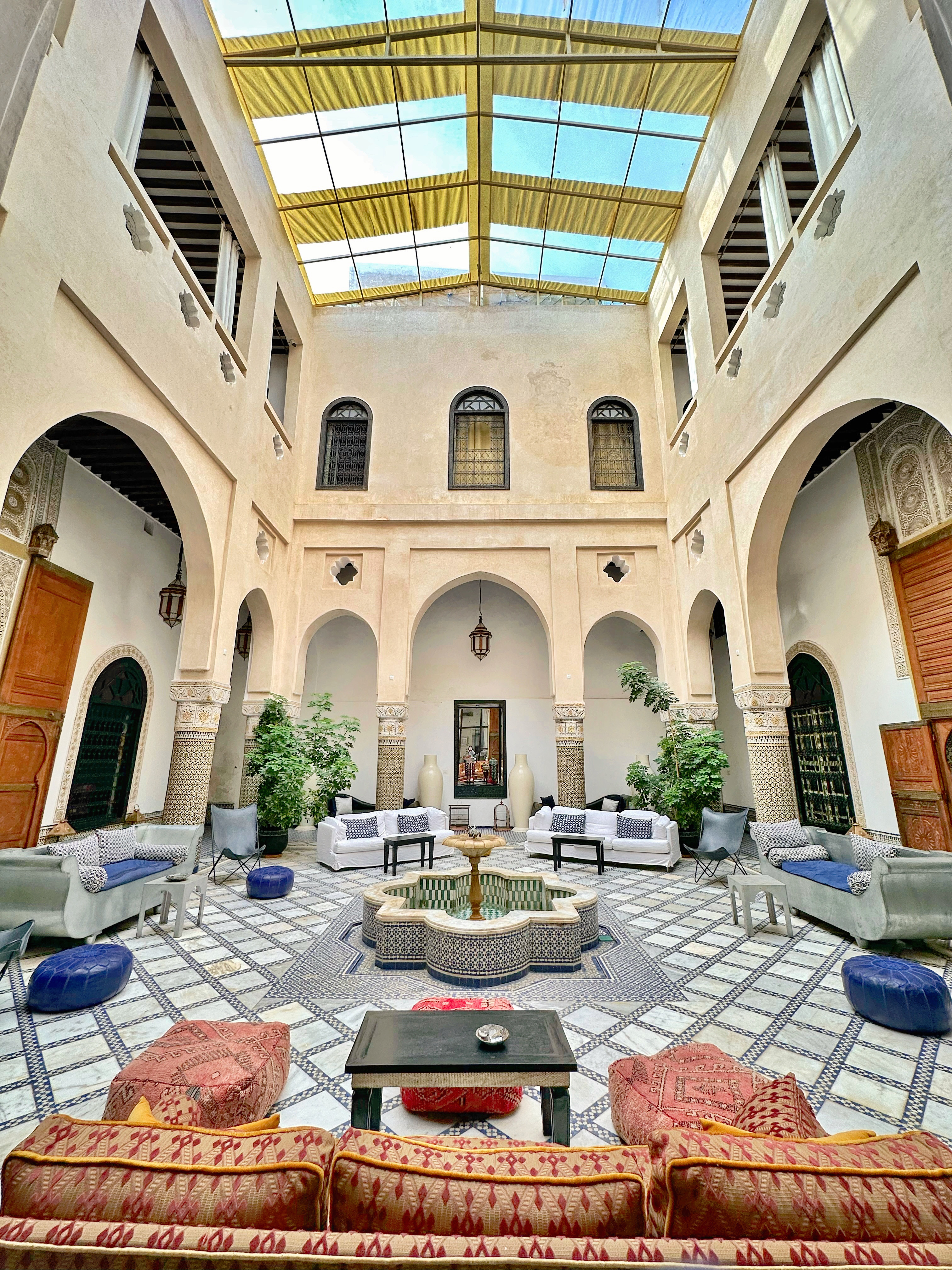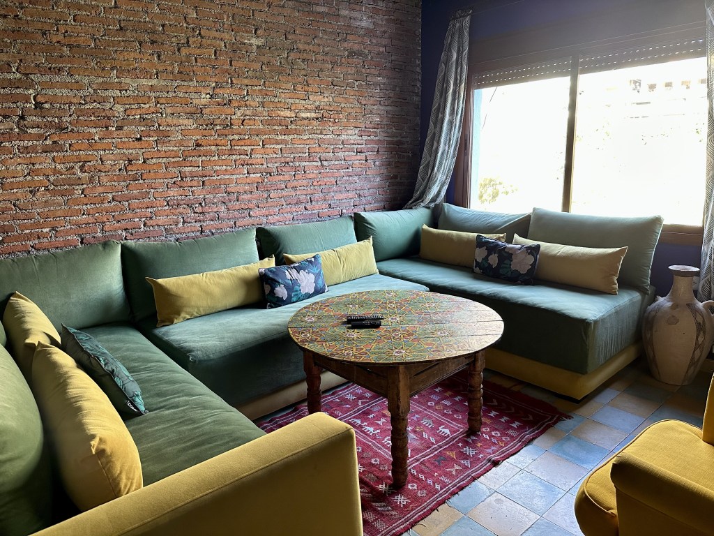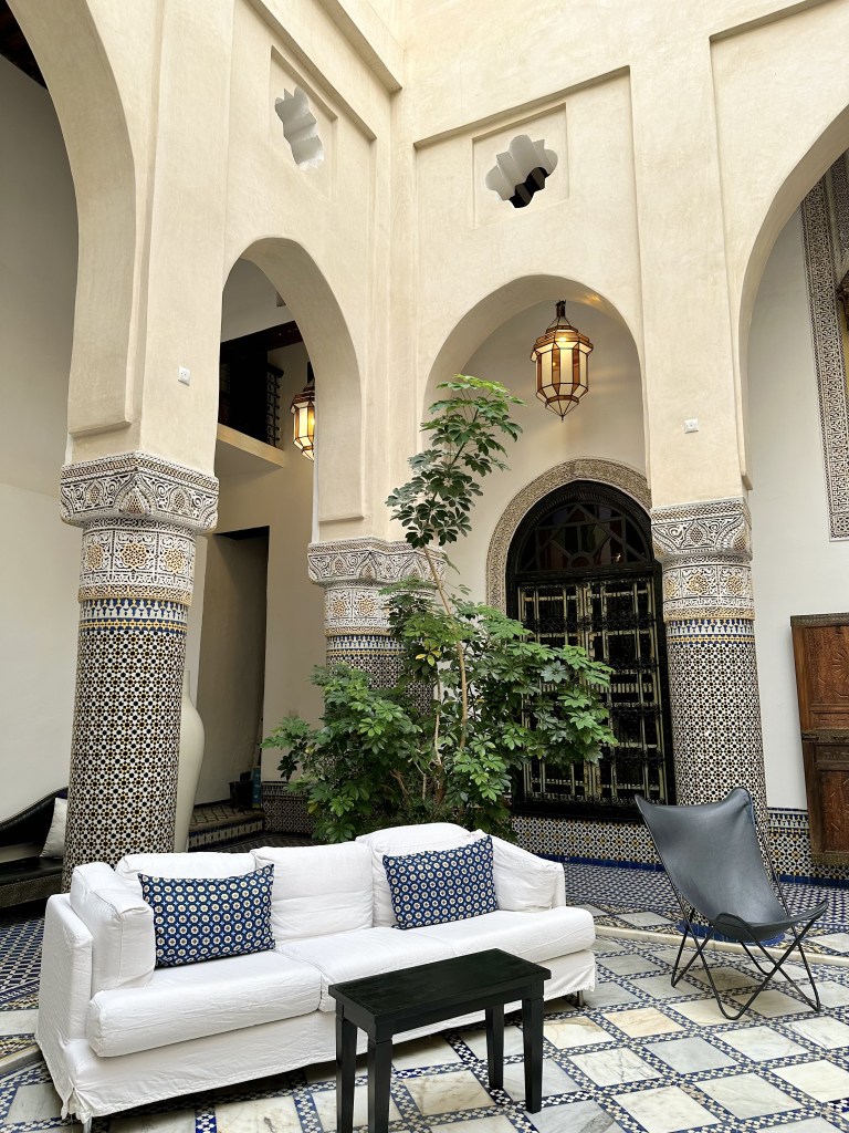 I love the central space of our Riad with its high structure and bright interior. We were so tired we decided to plop down at the sofa and not moved while the host prepared some tea and snacks for us