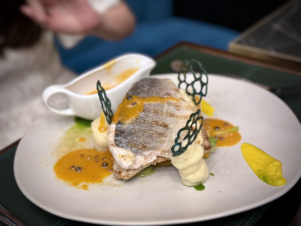Seabass Fillet w Cauliflower Puree, Coconut Milk Sauce, Lemongrass Dh155