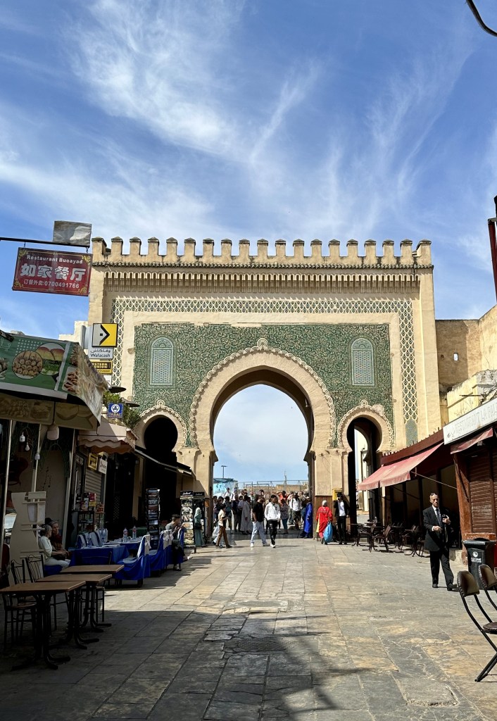 The most iconic portal to the old medina and the worldโs largest surviving medieval city and urban car-free zone. The blue on the side that greets new visitors represents the color of the city of Fes, which is famous for its pottery, painted with elegant cobalt blue designs while the reverse side, which faces the medina, is greenโthe color of Islam. And hence, the colour green here