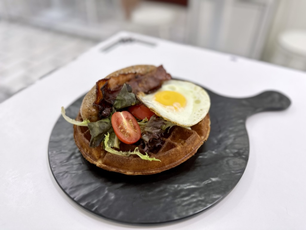 Waffle, Sausage, Bacon, Sunny side up, Maple