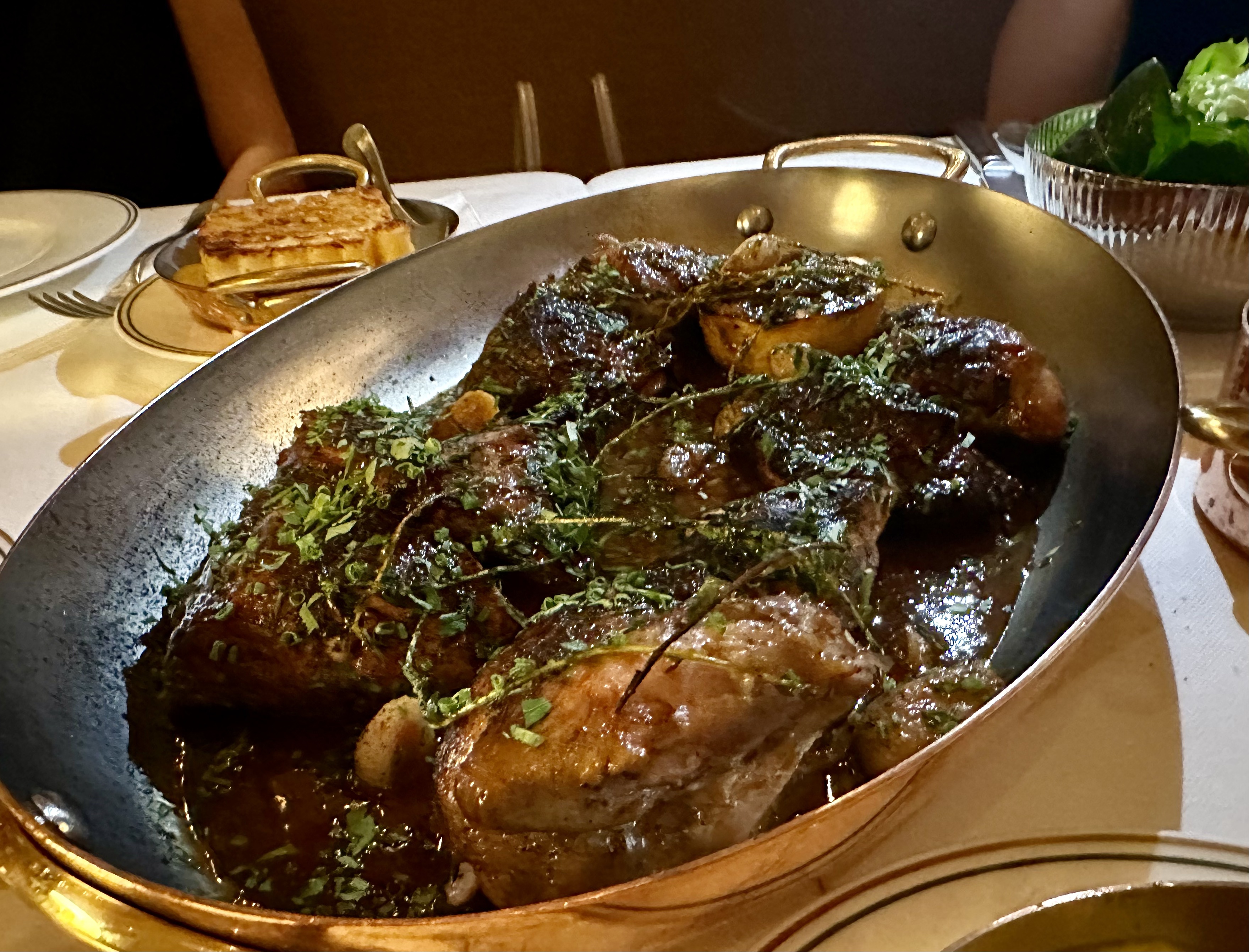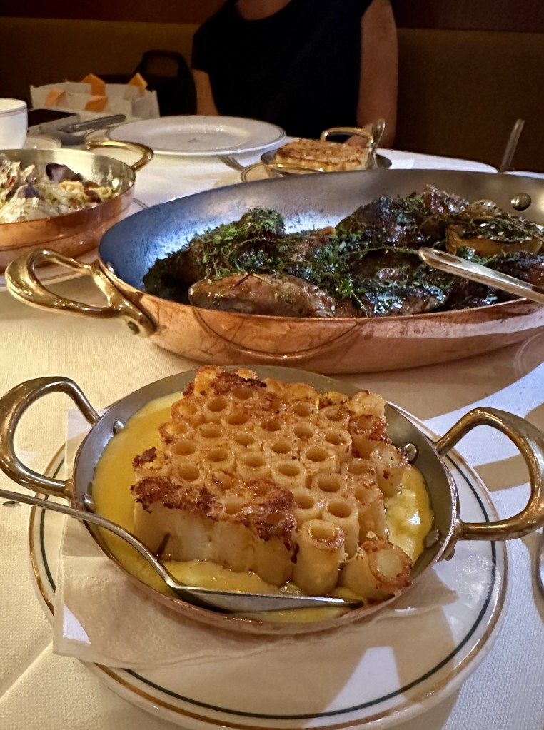Macaroni Pudding, Corn Velouté, Astoria Hot Sauce, Salad Verte with Yuzunette & Grilled Lemon