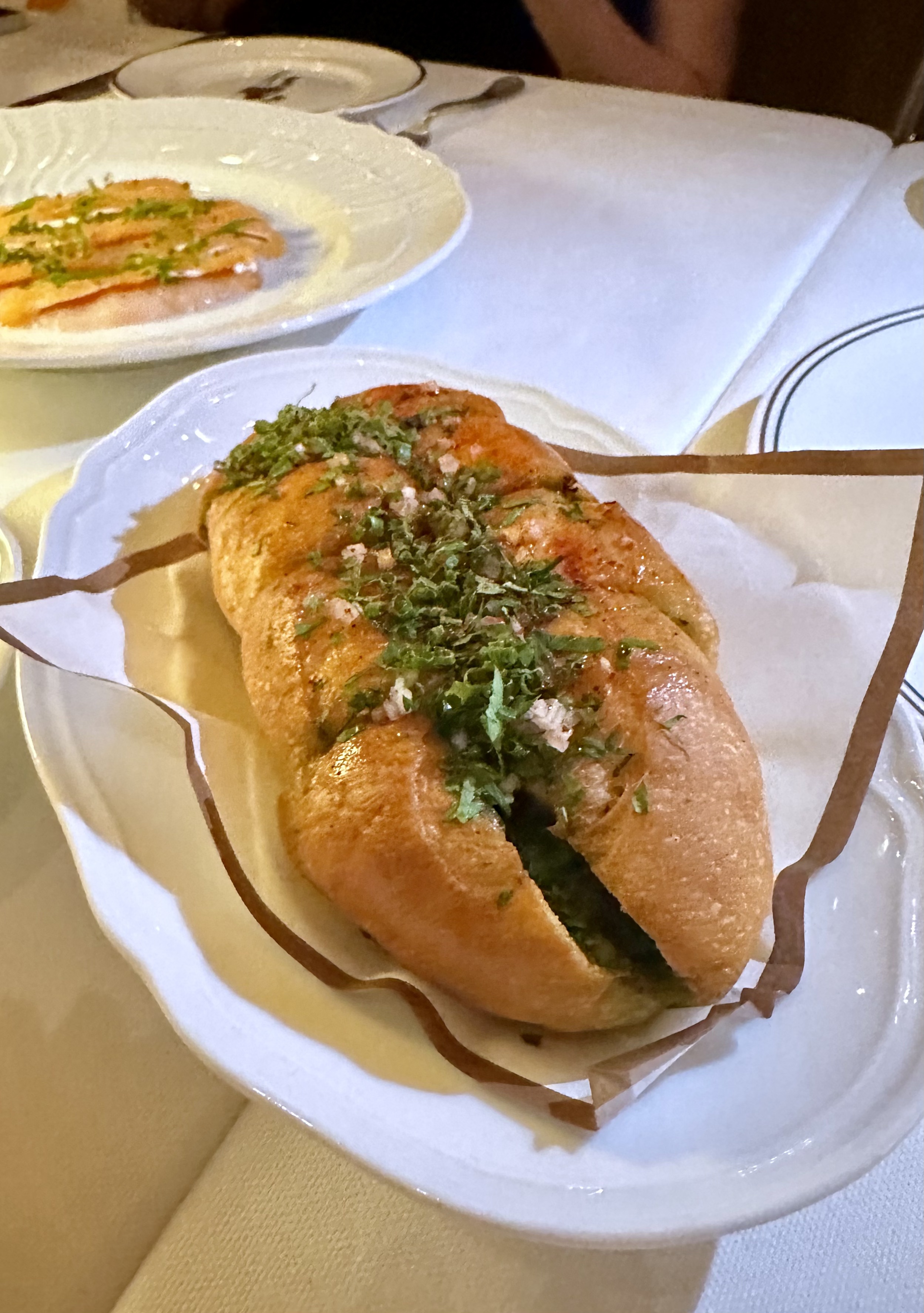 I listened. The garlic bread was different, yet tasty. You could taste the slight sourness of the sourdough, the softness of the baguette, and the fragrance of the herbs and butter