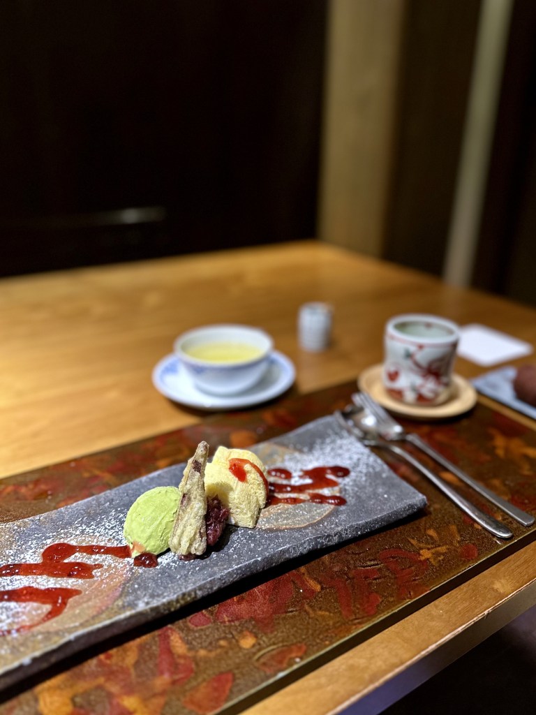 The matcha ice cream was okay, cake was a bit dry and the tempura was strange. I rather they had just added a wafer instead