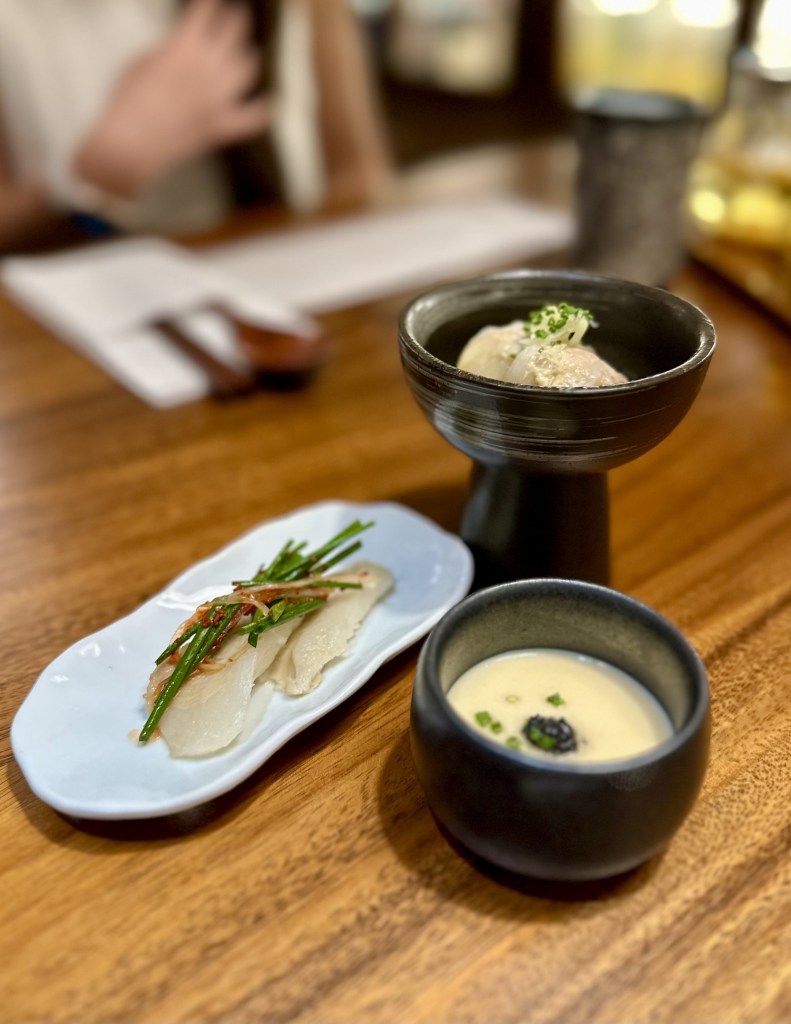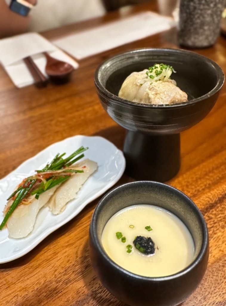 Comes with fixed complimentary side dishes of Korean Steamed Egg with Truffle, Sungchae Dumplings and Pork Belly w Chives Salad