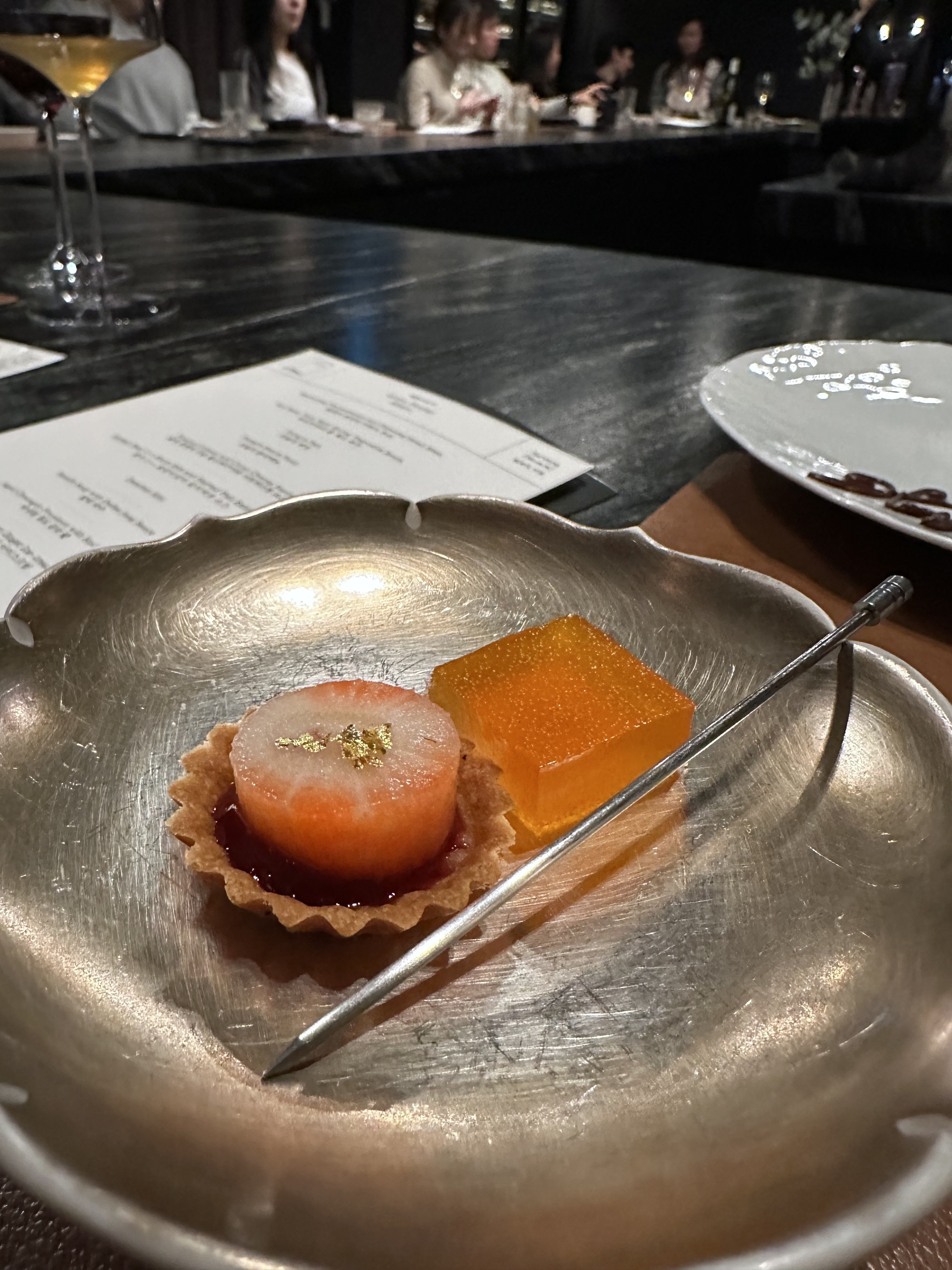 Also, another beautifully presented dish. In my opinion, the prawn chip and rice chip with seaweed left the most impression. The chip was so thin but yet the flavour was strong on its own, leaving a lingering aftertaste on your palate. I liked the cracker with snow crab/soy crab as well. The slight crisp with the umami of the crabs was satisfying. I thought the mini taco with salad was decent too