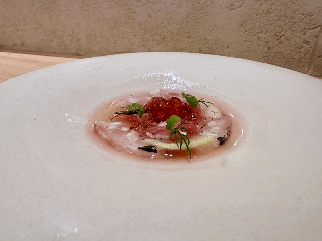 Shima Aji Carpaccio, Pickled Dashi, Hashinda Gin Salt