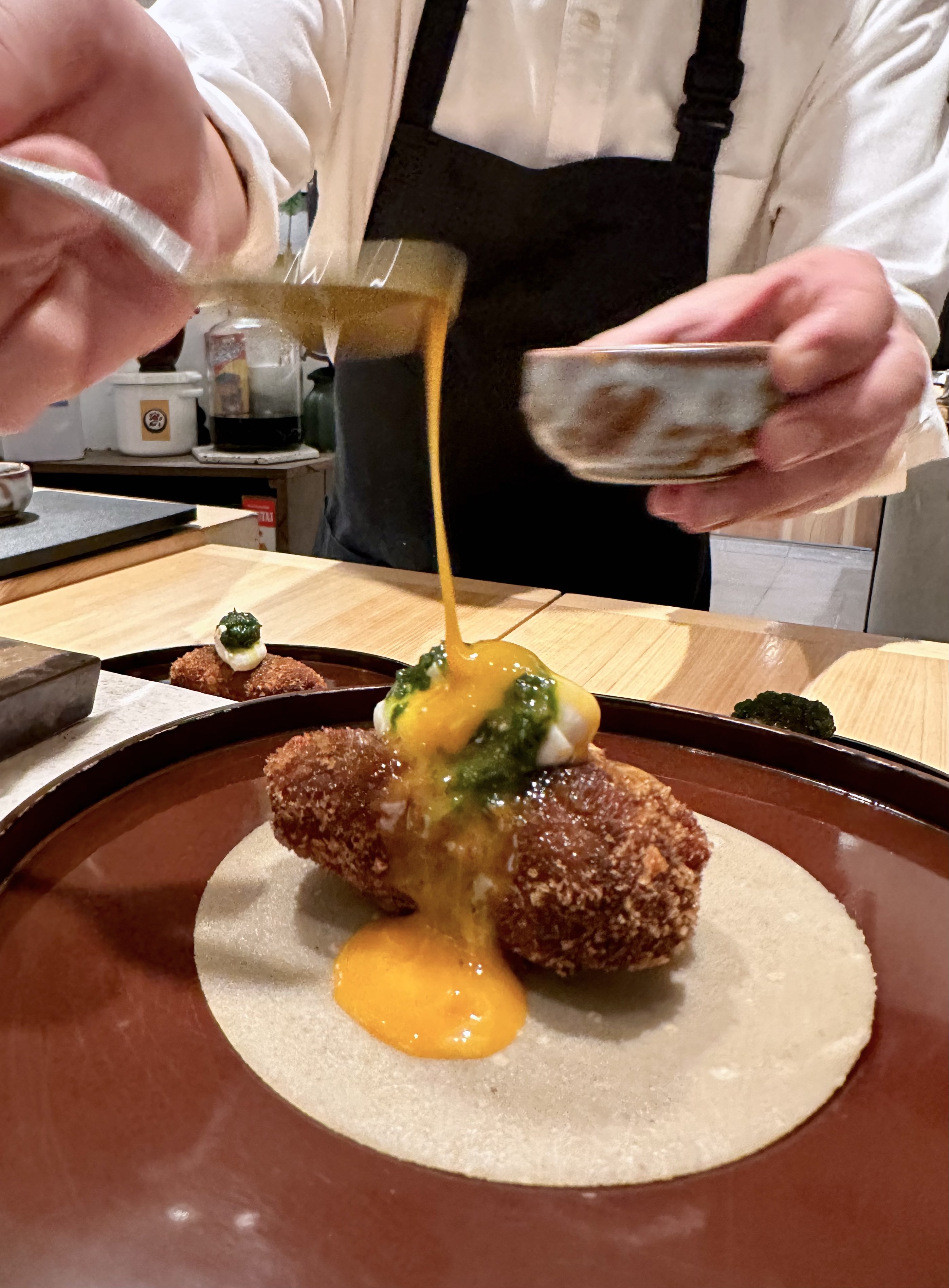 Inspired by sukiyaki, hence the egg yolk. Yet instead of the usual sukiyaki, they used Wagyu Menchi Katsu as the proteins, balanced by tofu emulsion and shungiku sauce. We were advised to wrap it up like taco and eat it. I thought the katsu was good on its own. The taco seemed.. out of place