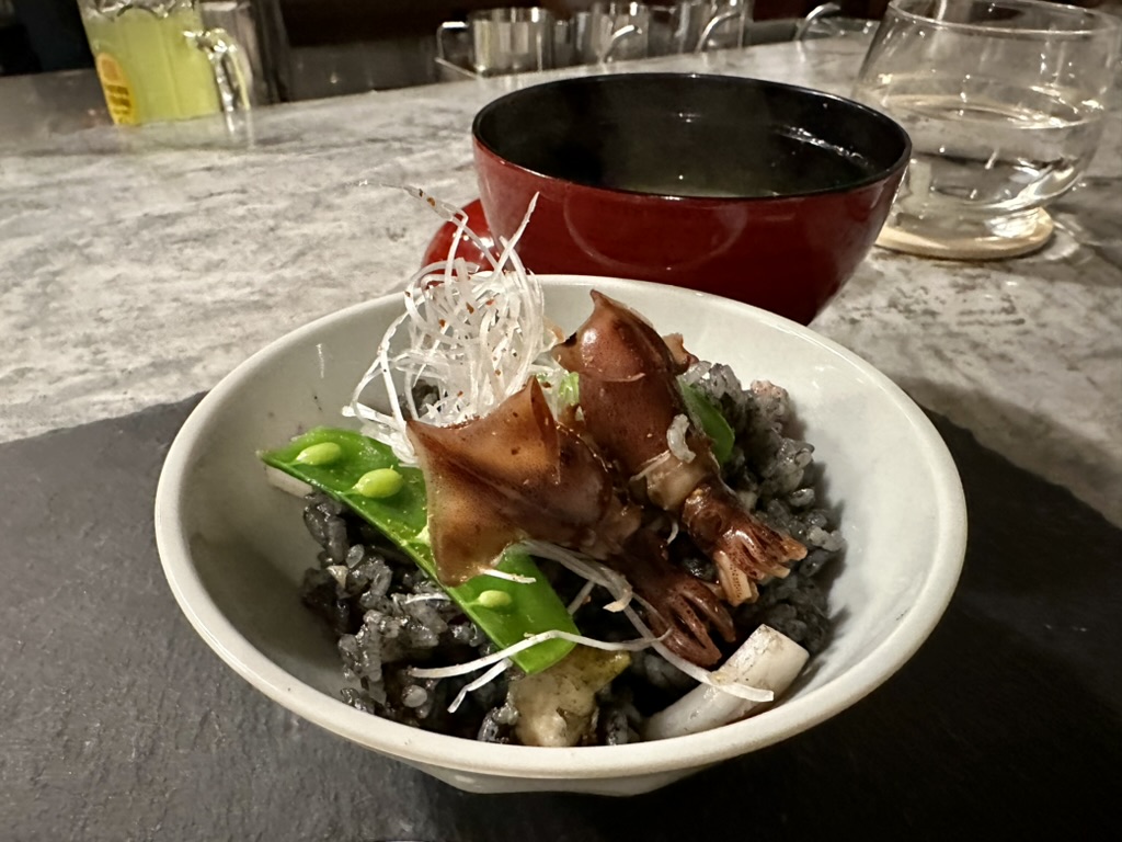 Garlic Rice: Squid Ink Fried Rice, Hotaru Ika, Maitake Mushroom, Fresh Seaweed Soup