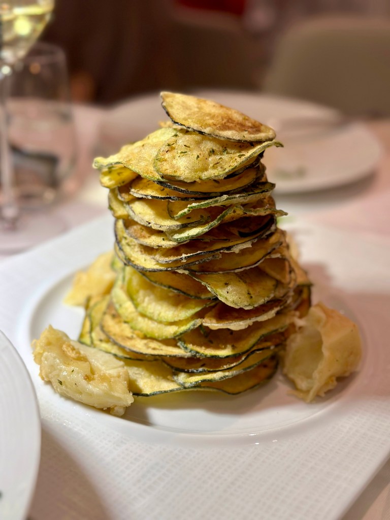 Lightly fried zucchini and eggplant tower, saganaki cheese and tzatziki