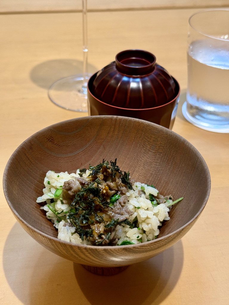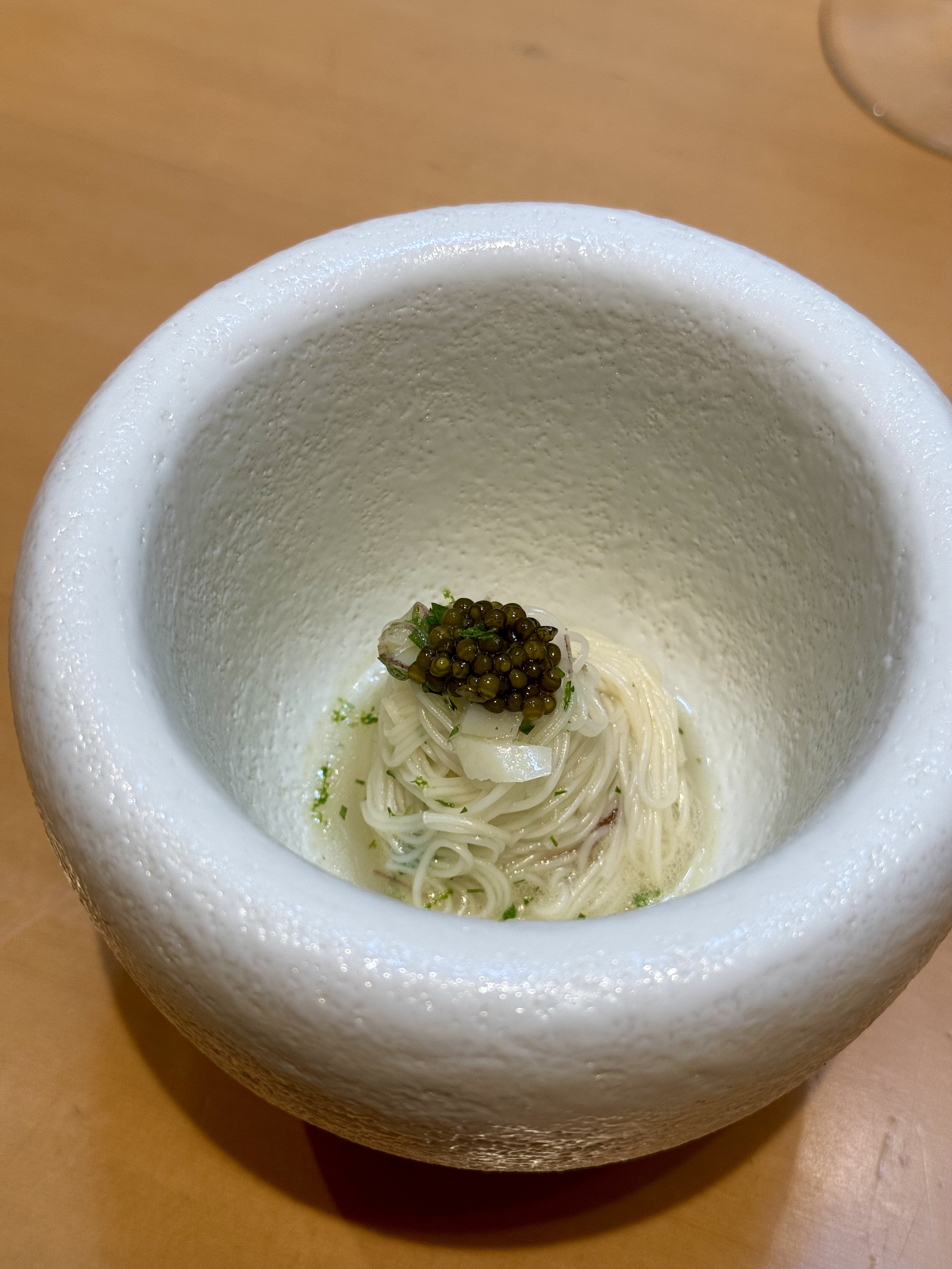 Cold somen served with hamaguri and shiso. The somen was well cooked. You could taste the thin strands of noodles as you chew on it. Overall flavour was pretty light but yet finished with a slight saltiness of the caviar