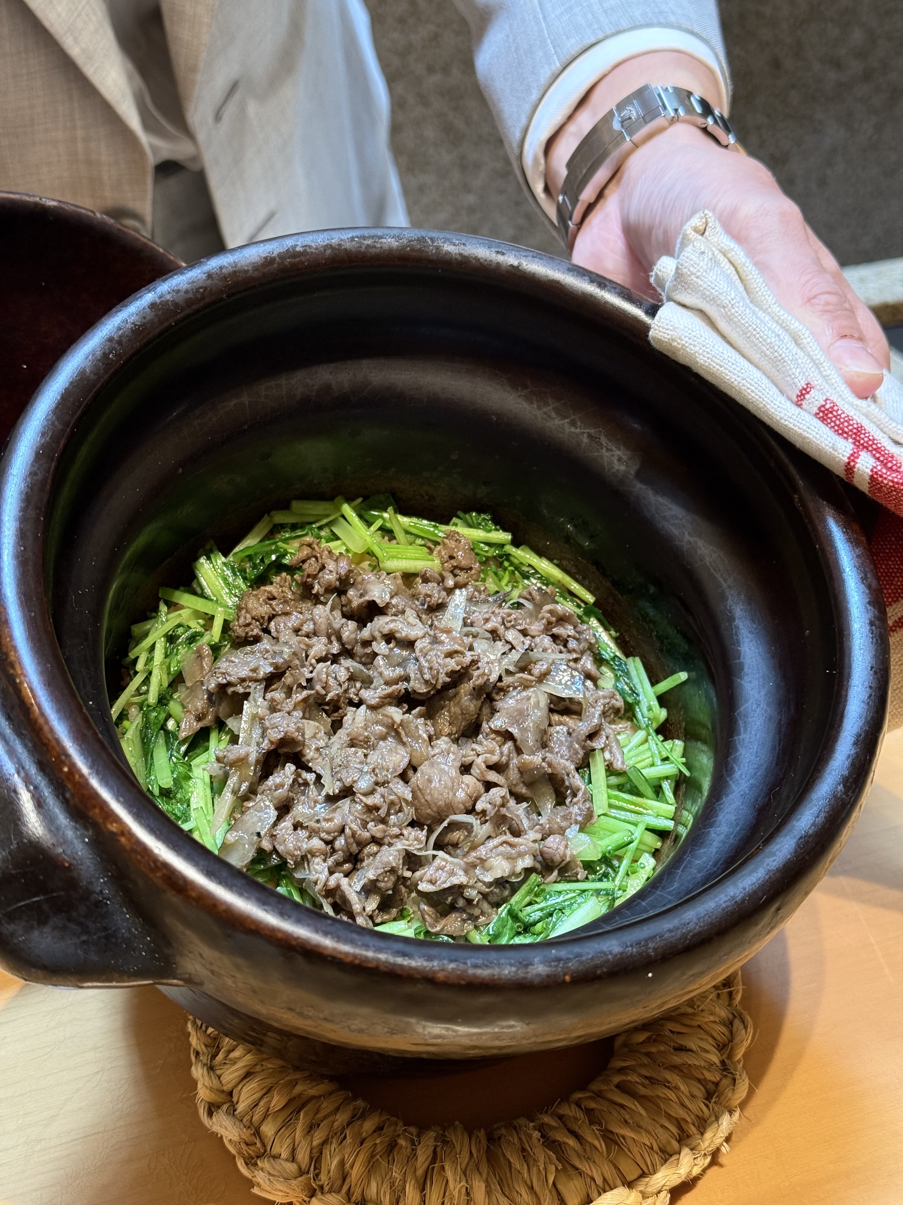 A fragrant bowl of donabe with an earthy mix of vegetables