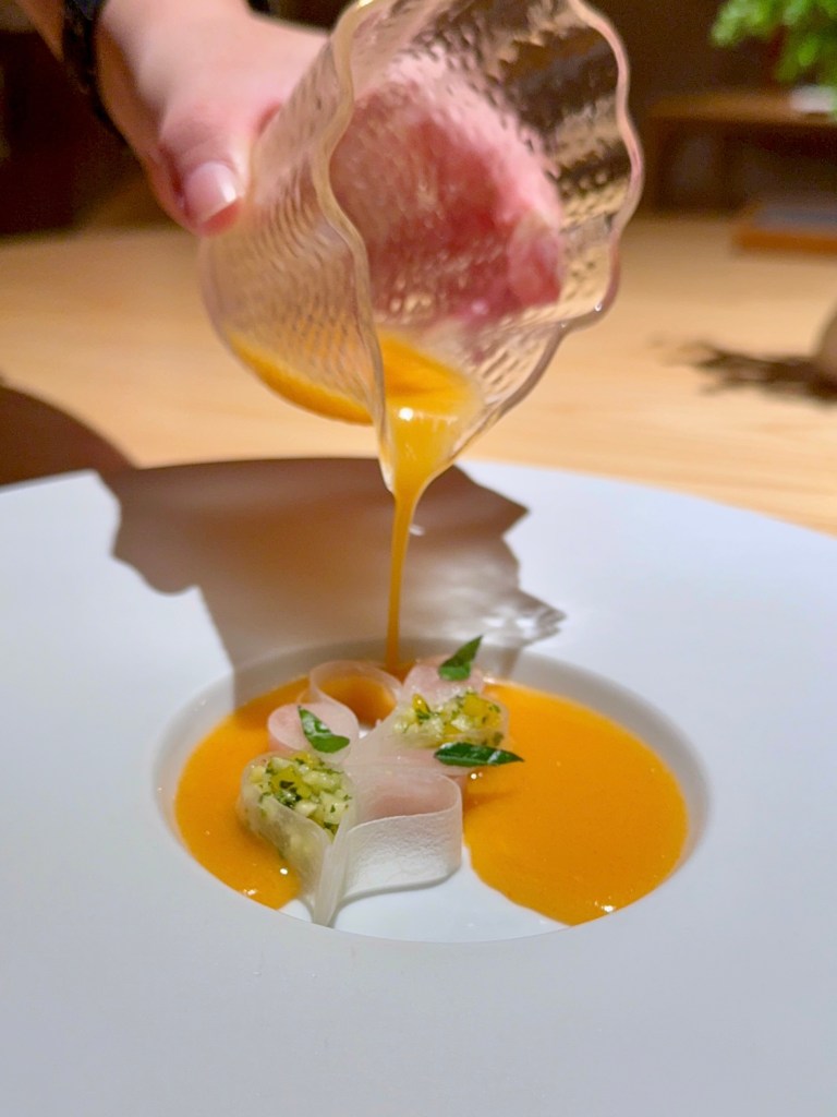 I tried the broth first. Wow, it’s good. More impressive cos they actually used starfruit juice and chilli prawn oil to recreate flavours of Assam. The beautifully plated dish of sliced starfruit, sweetness of the jackfruit and texture of the amberjack really comes through as you enjoy the ’assam’ sauce together