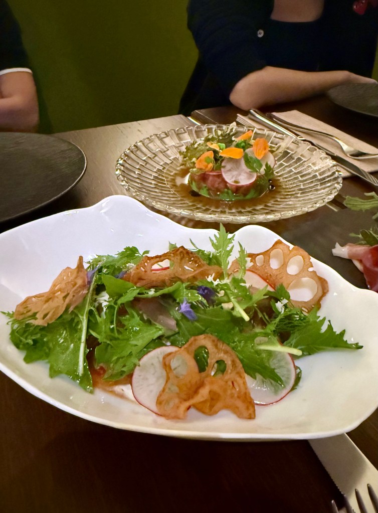 Kumato Tomatoes, Wasabi Oil, Lotus Root Chips, Mizuna