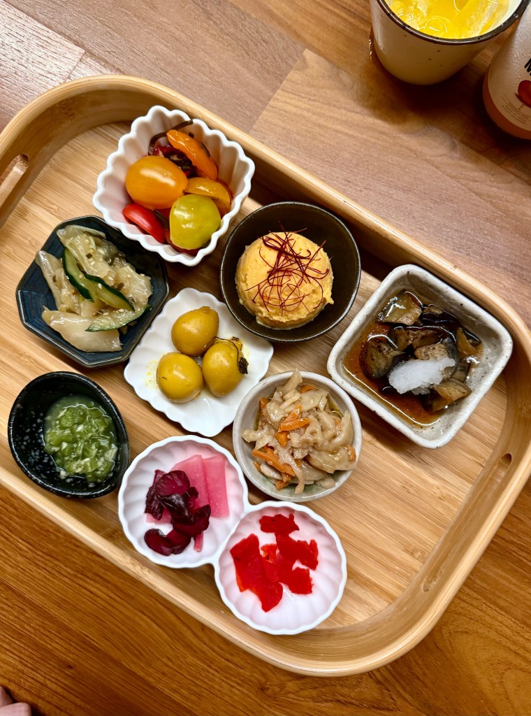 Obanzai: Dashi Eggplant, Potato Salad, Japanese Vindaloo Egg, Ume Heirloom Tomatoes, Renkon Kinpira