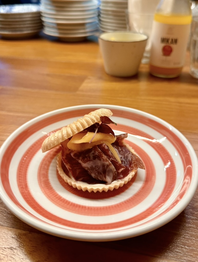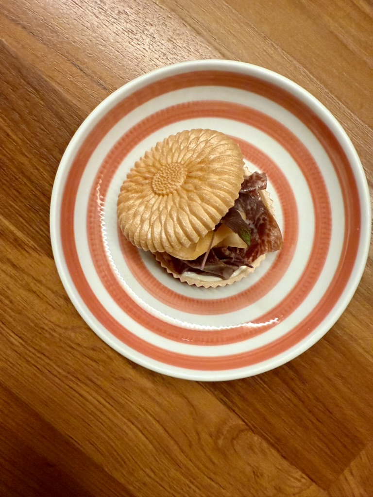 Air-Dried Wagyu Ham w Monaka, Chargrilled Rockmelon pickled with Ume, Mascarpone, Fermented Chilli, Honey, Hazelnut