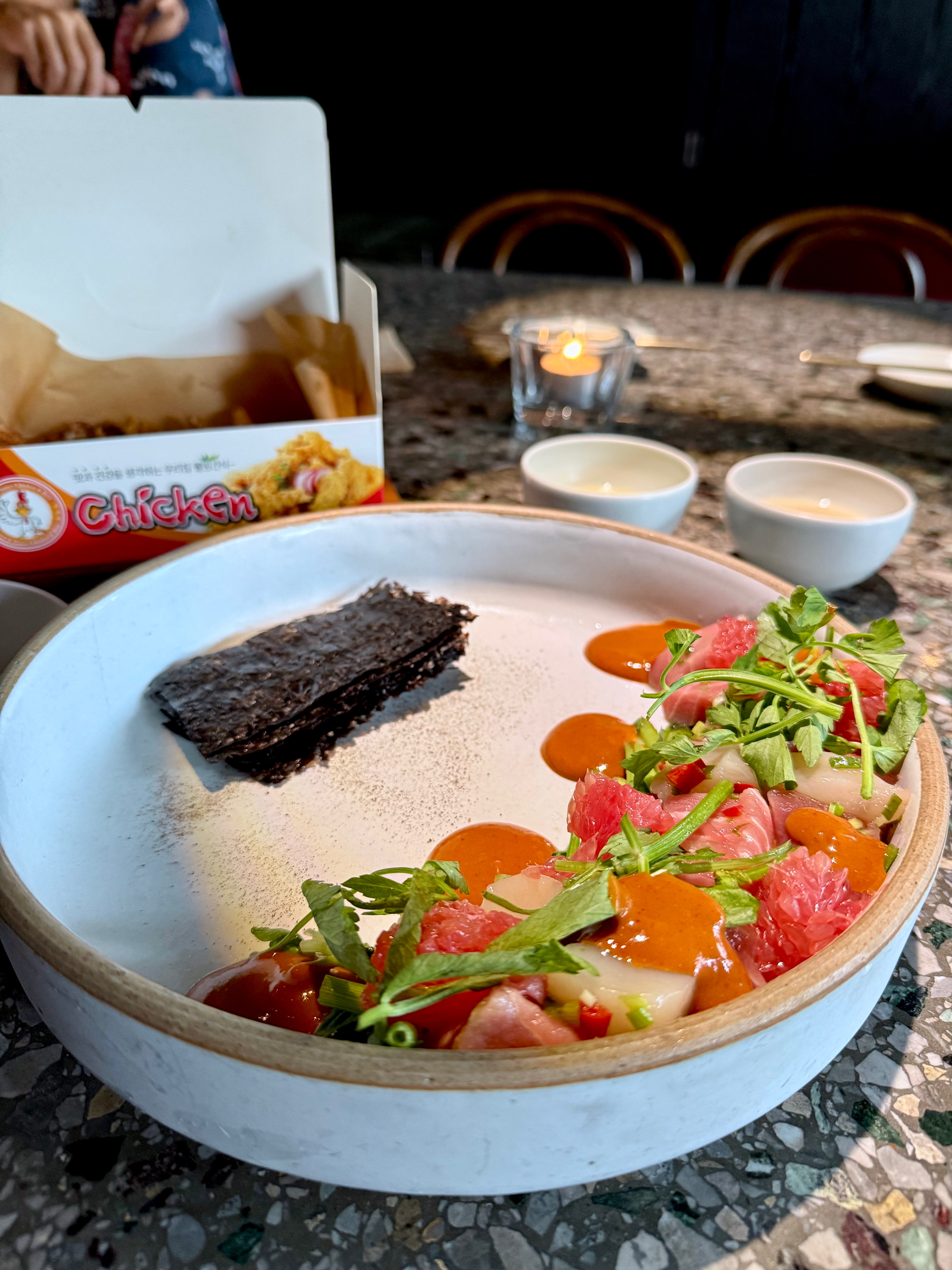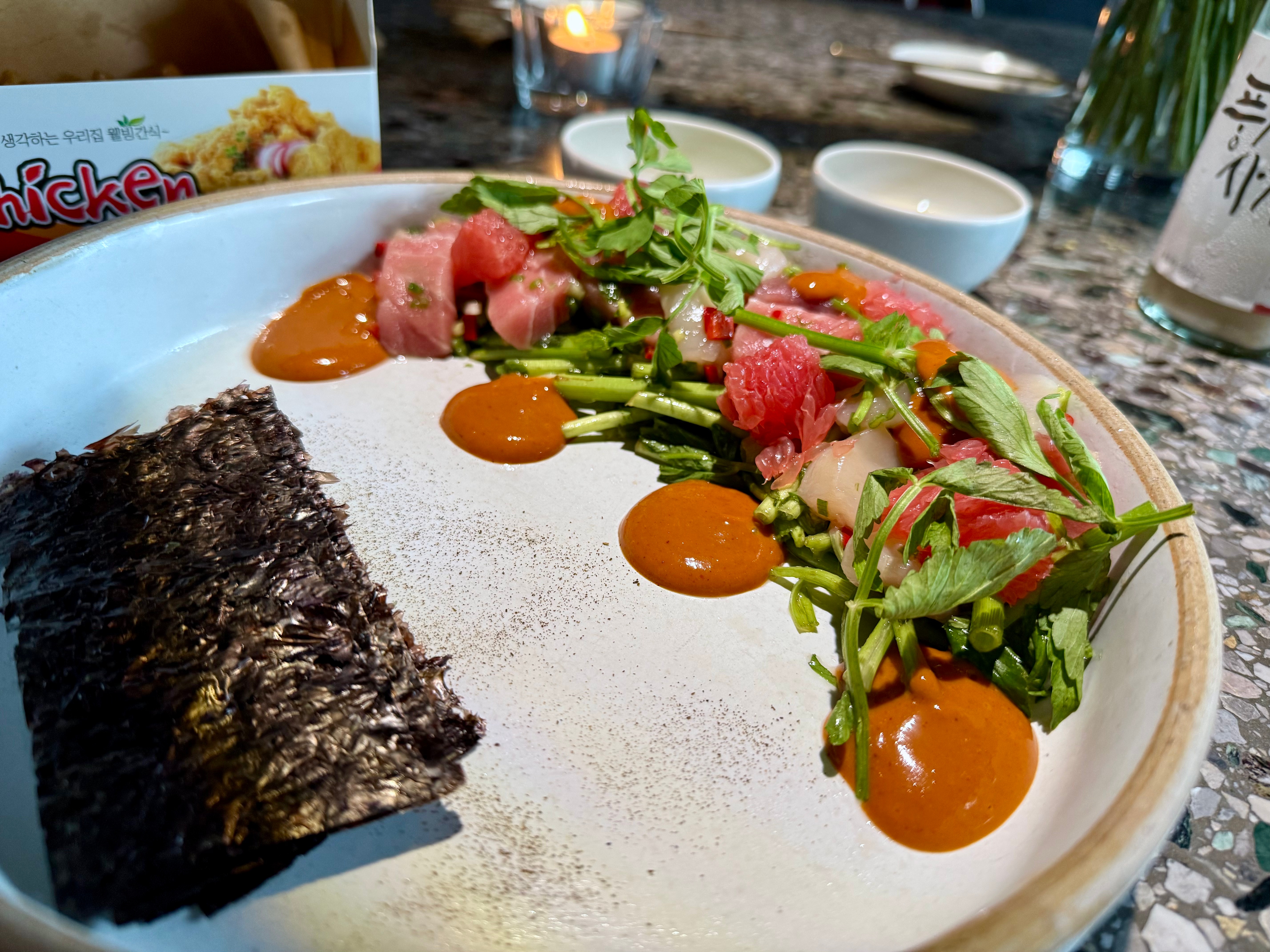 Hwe Muchim – Raw Tuna Belly, Scallop, Grapefruit, Minari, Gochujang &Yuja Sauce, Seaweed KRW33,000