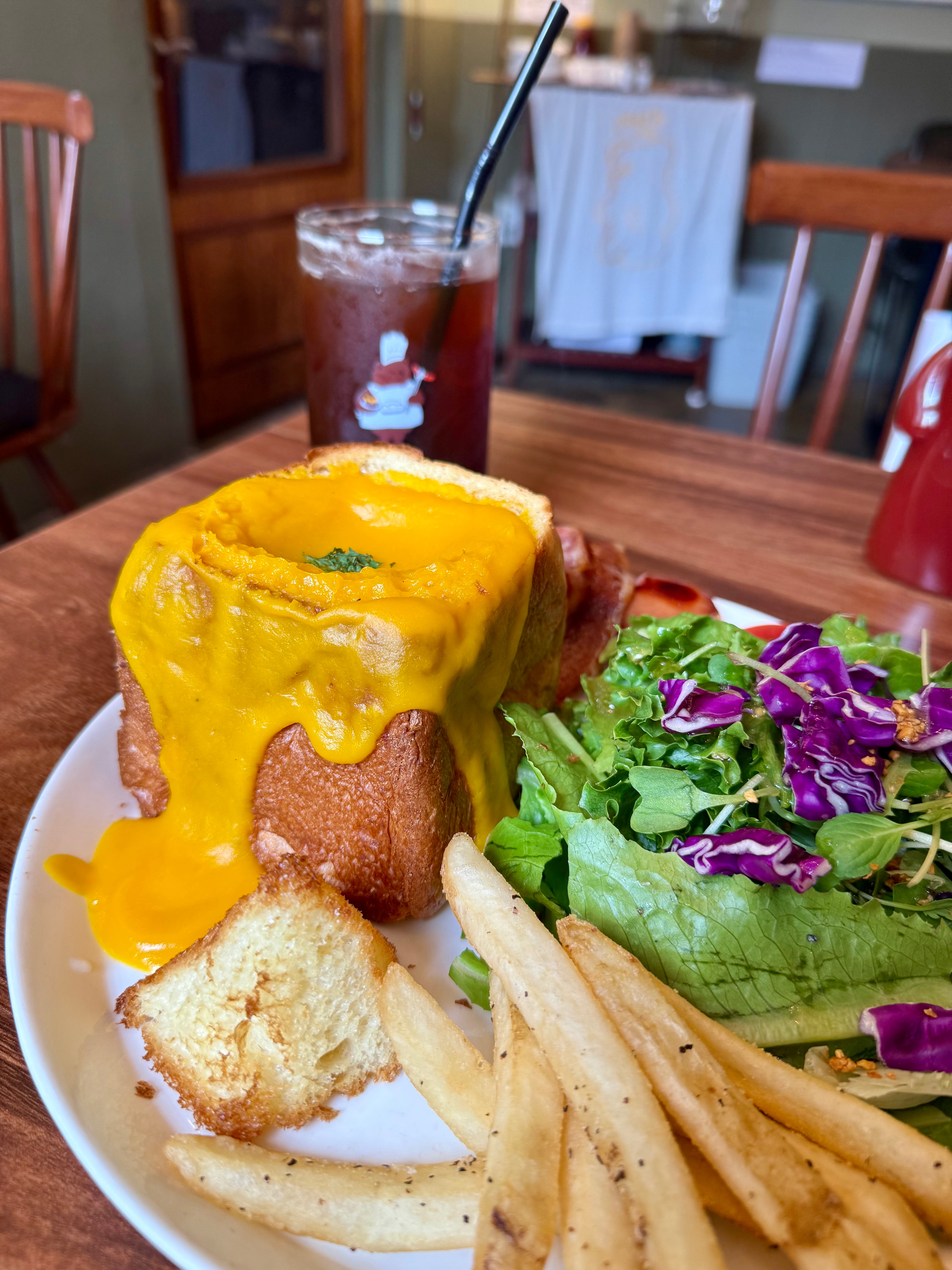 Bread with a pile of pumpkin sauce, fries, salad and Iced Black
