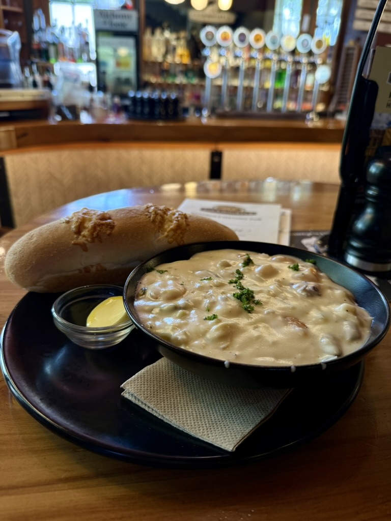 It’s a pub, complete with pub food and there was quite a crowd for lunch. I wanted something light so I ordered a seafood chowder and fries