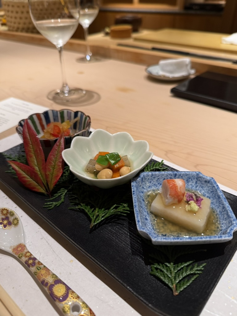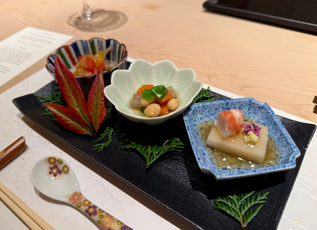 Seasonal Appetisers – Japanese Simmered Fish, Daizuni beans w Konjac Jelly, Mountain Yam Tofu with Tiger Prawn