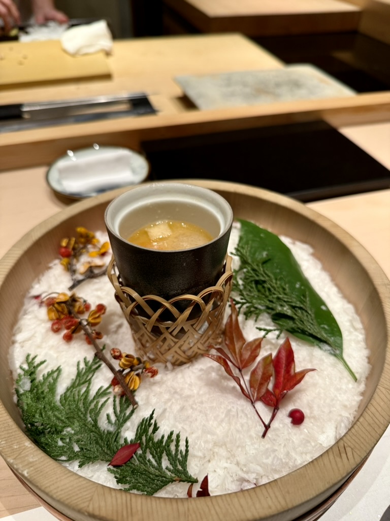 Starting with a soup to warm the stomach, cooked with salmon bones, white miso, sake. This tasted like ABC soup. It has both the sweetness + slight sourness to it, yet balanced and hearty. Chef said it’s a good 解酒汤 if you had too much of a drink