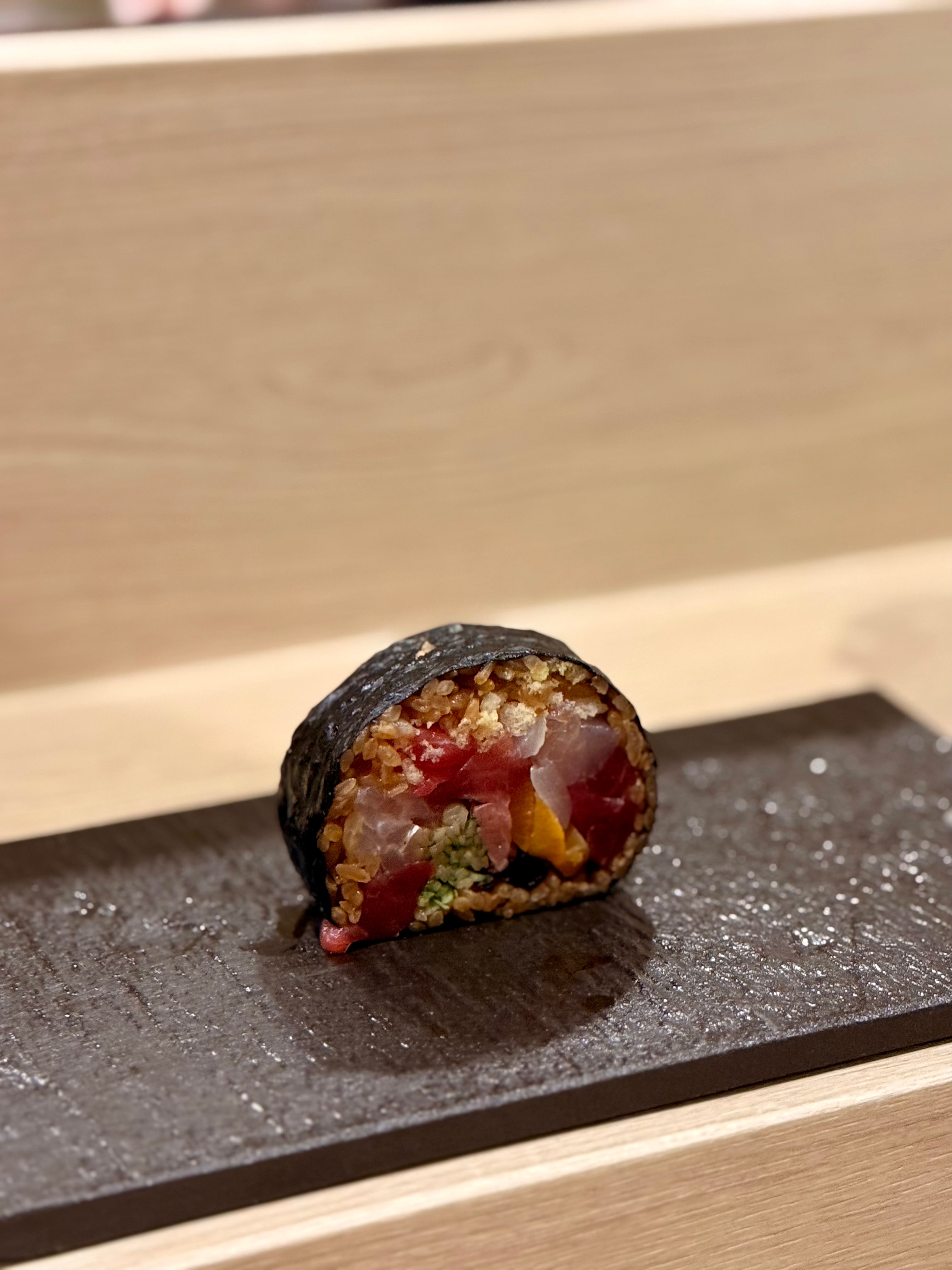 Another of chef’s signature which was recommended to be eaten in one bite (but obviously quite difficult), I like the crunch and texture especially with the pickles and it was a maki that packed a punch