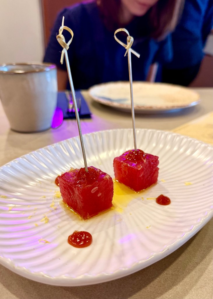 We started with a complimentary watermelon appetiser that was drizzled in olive oil which was well, okay I guess