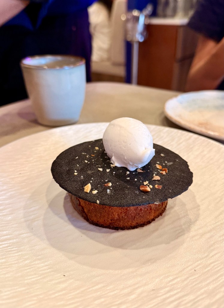 The hazelnut filing reminded me of salted caramel. We were confused. I thought the coconut ice cream was nice though not necessarily a good pairing together. We also had a complimentary blue cheesecake as birthday dessert which wow, either you like it or don’t